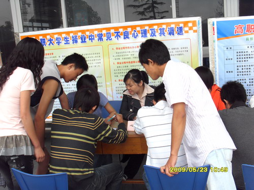 连日来,由院学生处、心理咨询中心主办,团委、心理协会承办的“5·25大学生心理健康周”系列活动,在学生食堂楼前广场如期举行。本次活动旨在帮助学生塑造健康的就业心理,正视严峻的就业形势现状,转变就业观念,调整就业期望,摆正就业心态。