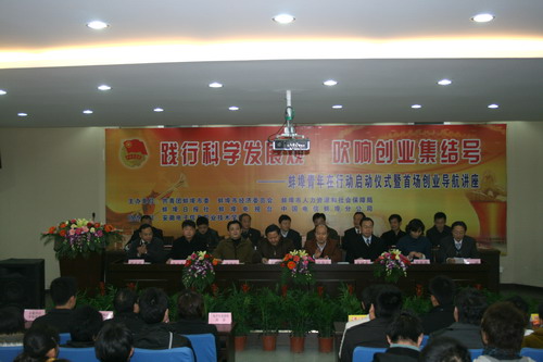 11月15日下午,由团市委等六部门主办、学院协办的“践行科学发展观,吹响创业集结号——蚌埠青年在行动”启动仪式在我院举行。团省委副书记汪华东,蚌埠市领导王勇勇、陈桂林、袁树友,以及学院领导张永生、韩光辉等出席启动仪式。