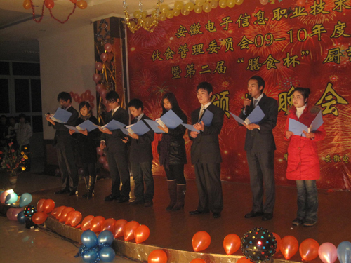19时整,晚会在悠扬的歌声中拉开了帷幕。袁益强副院长代表学院领导发表了热情洋溢的讲话,对晚会的举行表示热列的祝贺。他首先向全体员工致以节日的问候,肯定了后勤集团饮食服务中心在本学期取得的成绩和对学院作出的贡献,并向厨艺大赛获奖人员表示热烈的祝贺,同时也希望伙食管理委员会在新的一年里能继续发挥学生组织的监督作用,在院团委和后勤集团的领导下,发扬无私奉献的精神,更好地为广大师生服务,为学院的和谐校园建设添砖加瓦。