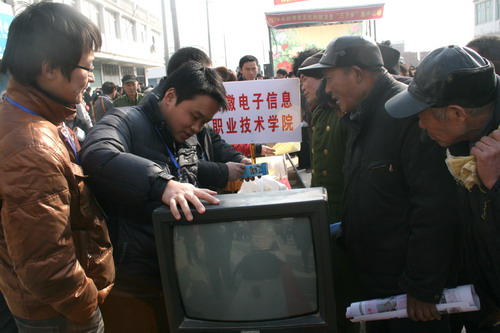 元月28日,由蚌埠市委宣传部组织的2010年全市春节文化、科技、卫生“三下乡”集中活动在固镇县新马桥镇举行,学院组队参加了此项活动,为老百姓提供家电维修专项服务,受到了热烈欢迎。