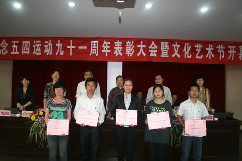 大会在雄壮的《国歌》、《团歌》声中开幕,韩光辉同志作了重要讲话,对全院团员青年致以节日的问候,对受表彰的同学表示衷心的祝贺。袁益强分别宣读了学院各级团组织和团员个人受市级和院级表彰的同志名单。院领导分别为获奖者颁奖并合影留念。