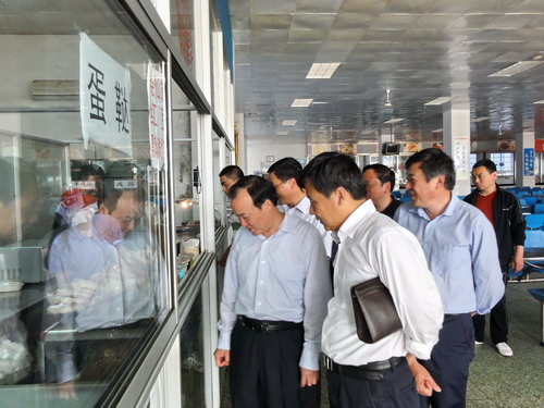 当天下午,张德山一行刚来到学院,就在院领导的陪同下来到学生公寓进行仔细察看,对学生公寓门径系统大加赞赏,并与宿管人员和同学进行交流。在监控室,当看到学生公寓各主要出入口在监控下一览无余时,张德山非常满意,并与监控值班人员进行了沟通交流。在学生食堂,张德山一行每到一处,都认真听取陪同院领导的介绍,提醒大家一定要注意食品安全,千万大意不得。