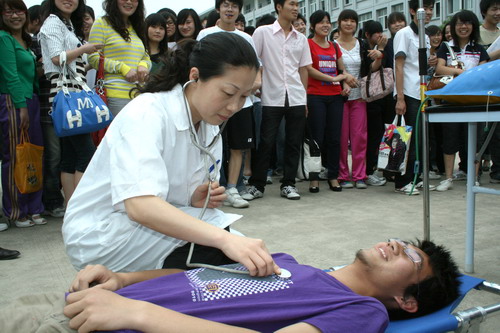 “呜——”,5月27日下午4点,学院教学楼前,随着刺耳的警报声响起,数千师生按照应急疏散路线紧急有序地从教学楼里鱼贯而出,医护人员忙不迭地为“伤员”进行救护。这是学院应急疏散演练现场的一幕。院领导张永生、韩光辉、袁益强等现场指挥并观摩了演练。
