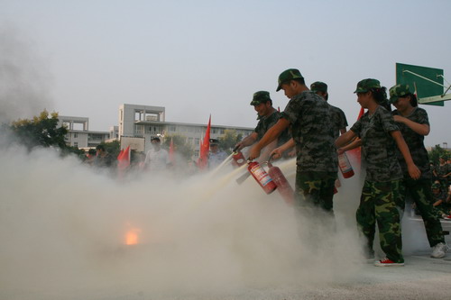一团熊熊燃烧的大火借着风势越烧越旺,在这紧急关头,几名身着迷彩服的矫健身影迅速操起灭火器,拉开保险栓,对着火苗猛喷一通,一团团白雾腾空而起,“消防人员”被淹没在浓雾中,几秒钟后大火被扑灭殆尽。这是9月17日下午发生在学院操场上的一幕。作为新生军训的一项重要内容,大一新生亲眼目睹了这一过程,其中有相当一部分亲自动手参与了灭火演练,让大家深受教育。蚌埠市消防支队邵学民工程师应邀为同学们作消防安全报告并现场指导了演练。