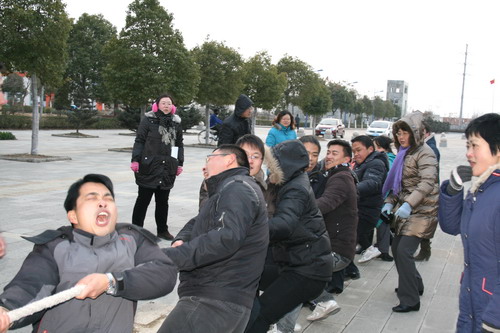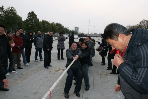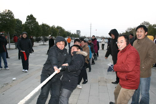 此次教职工拔河比赛以工会小组为单位,共分为8个小组,每组参赛队员男女各占一定比例,重在广泛参与性。当天的拔河比赛上,尽管寒风凛冽,气温降到了零下,但参赛队员个个精神饱满,使出浑身力气,身体向后倾,脸憋得通红,全然顾不了平时的“斯文”形象;场下观众为各自的队伍加油鼓劲,双方的啦啦队互不相让,喊声和欢笑声不断。经过激烈角逐,行政二工会小组获得了本次拔河比赛的第一名,行政一工会小组、计算机科学系和实训中心工会小组分列二、三名。