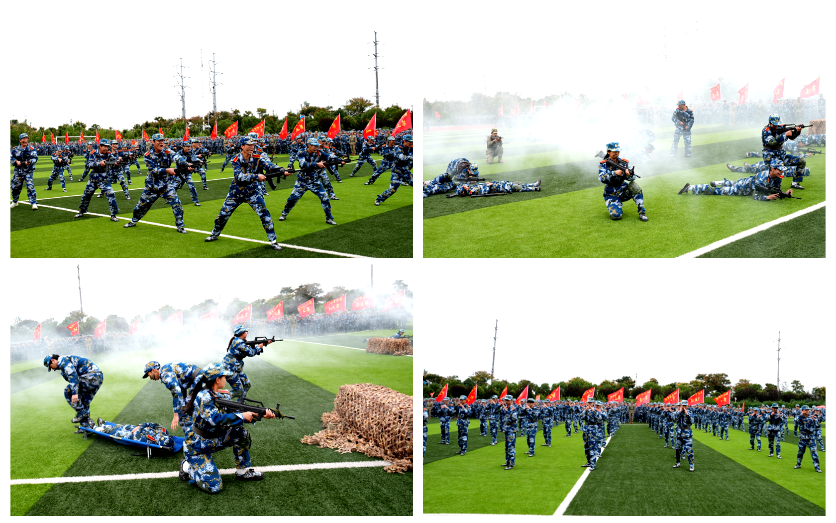 大会第二项,各方阵进行军训成果展示。刺杀方阵率先登场,一声“杀”声震天,他们凛然列阵,目光如炬,展现出狭路相逢勇者胜的钢铁意志。战术方阵紧随其后,硝烟四起,尖兵凝眸摸排敌情,主力部队步步推进,精准制敌。格斗术方阵闪电出场,拳风凌厉,呼声震天,每一个动作都淬炼着勇猛坚毅的铁血精神。战场救护方阵匍匐前进,与时间赛跑,诠释着团队的战斗力与凝聚力。部队指挥员下达指令,分列式开始。在激昂澎湃的分列式进行曲中,各连队优秀方阵依次走过主席台,学子们身如青松挺拔,展现出昂扬向上的精神风貌。