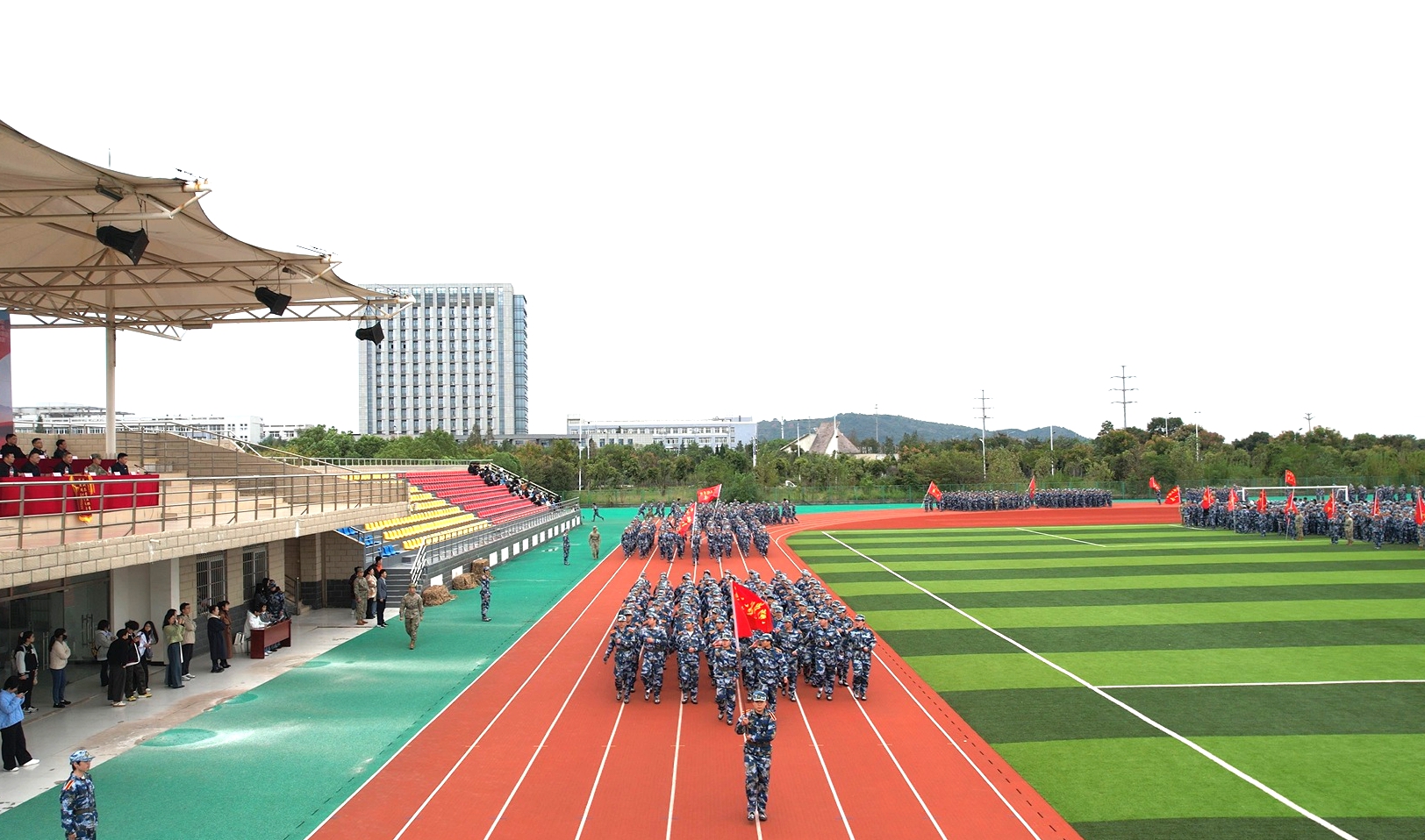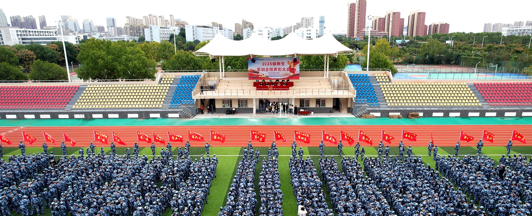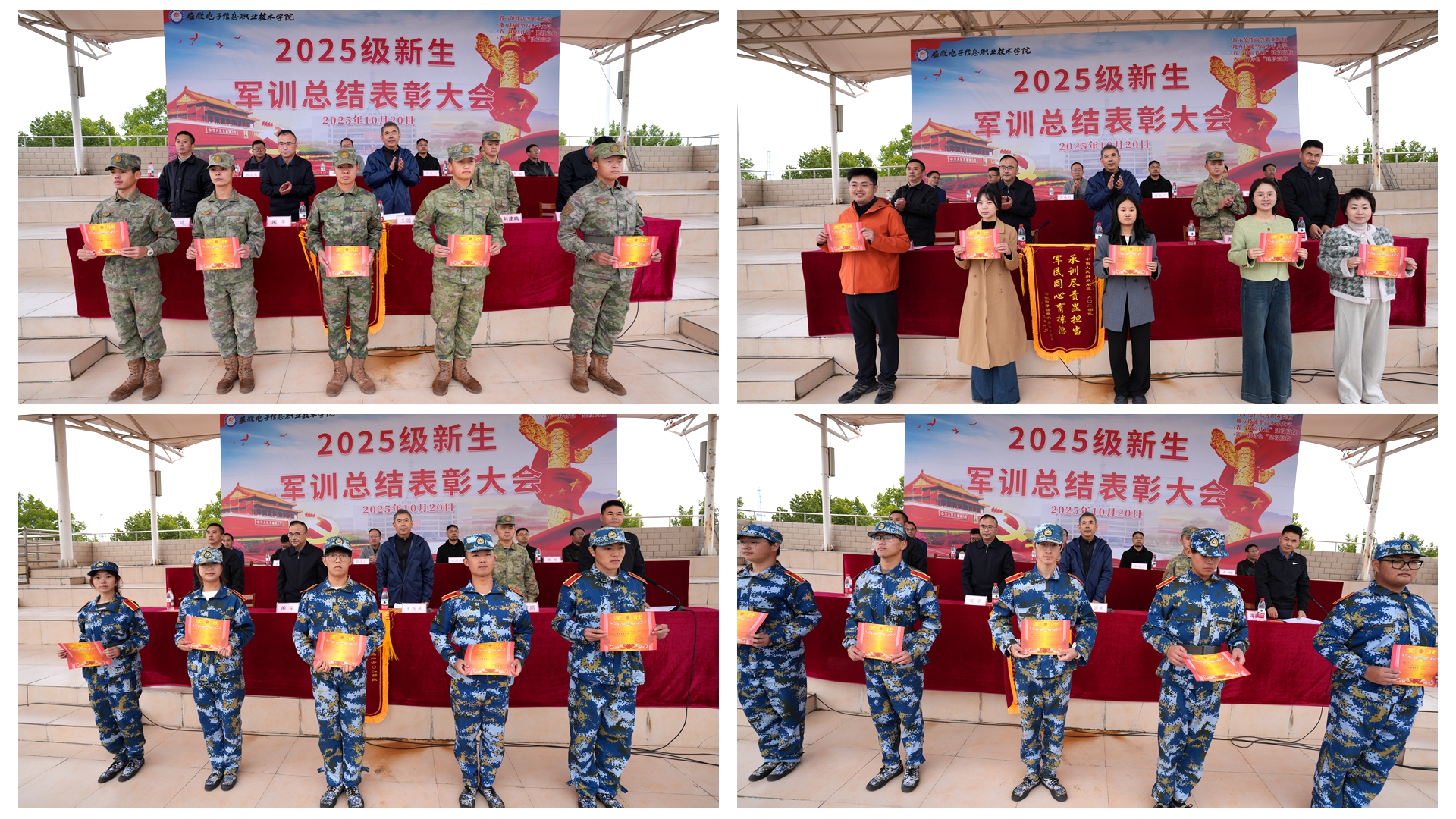 本网讯 10月20日上午,学院2025级新生军训总结表彰大会于学院西田径场圆满举行。党委书记王国武,承训部队刘建鹏上尉,党委委员、副院长闻学,党委委员、副院长冯兴祥,党委委员王建出席大会,相关部门负责人、帮训部队教官代表、新生班级辅导员及2025级新生参加大会。大会由冯兴祥主持。