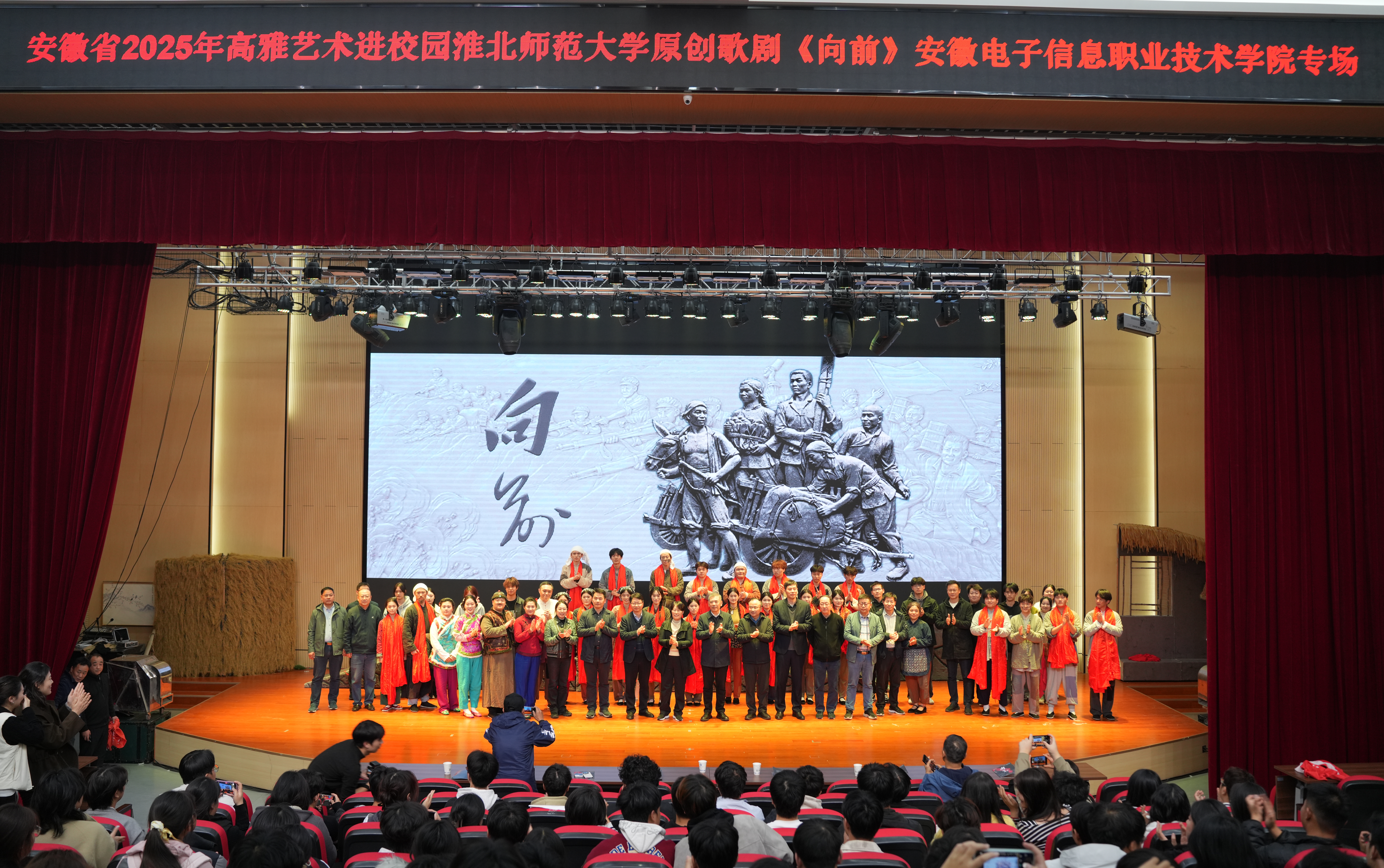 本网讯 11月11日晚,由安徽省教育厅主办、淮北师范大学承办的原创歌剧《向前》在学院实验楼报告厅盛大开演。学院领导王国武、李素文、闻学、冯兴祥、蔡学良,淮北师范大学团委书记马东,音乐学院院长袁茵出席活动。500余名师生共同沉浸式观看演出。