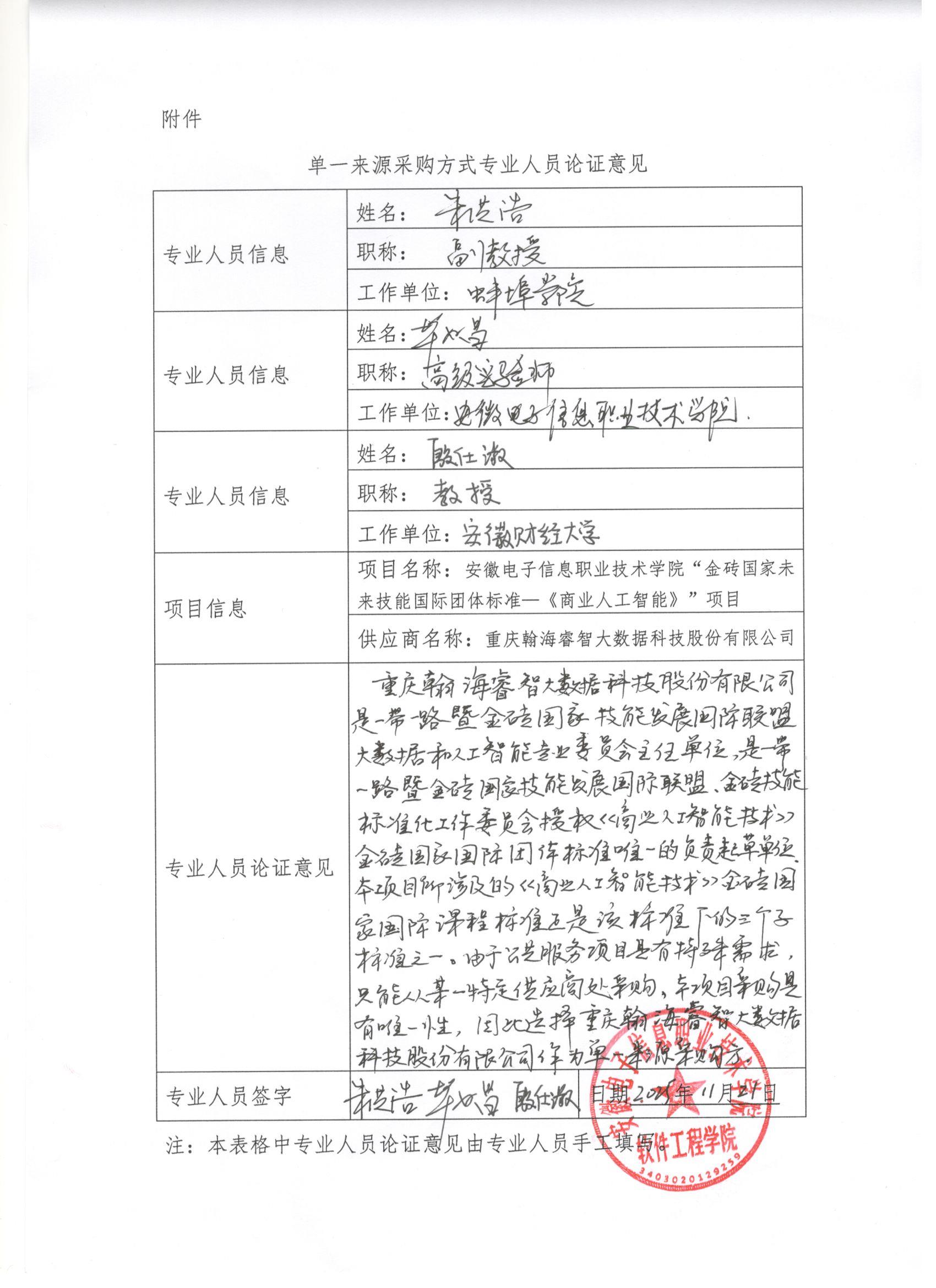 重庆翰海睿智大数据科技股份有限公司是一带一路暨金砖国家技能发展国际联盟大数据和人工智能专业委员会主任单位,是一带一路暨金砖国家技能发展国际联盟,金砖技能标准化工作委员会授权《商业人工智能技术》金砖国家国际团体标准唯一的负责起草单位。本项目所涉及的《商业人工智能技术》金砖国家国际课程标准正是该标准下的三个子标准之一。由于公共服务项目是有特殊需求,只能从某一特定供应商处采购,本项目采购是有唯一性,因此选择重庆翰海睿智大数据科技股份有限公司作为单一来源采购方。