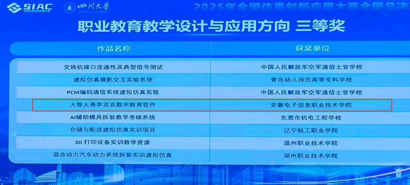 本网讯 11月21日至23日,2025年全国仿真创新应用大赛全国现场总决赛在四川大学举行,我院马克思主义学院教师团队喜获仿真教学应用赛道(职教组)三等奖。