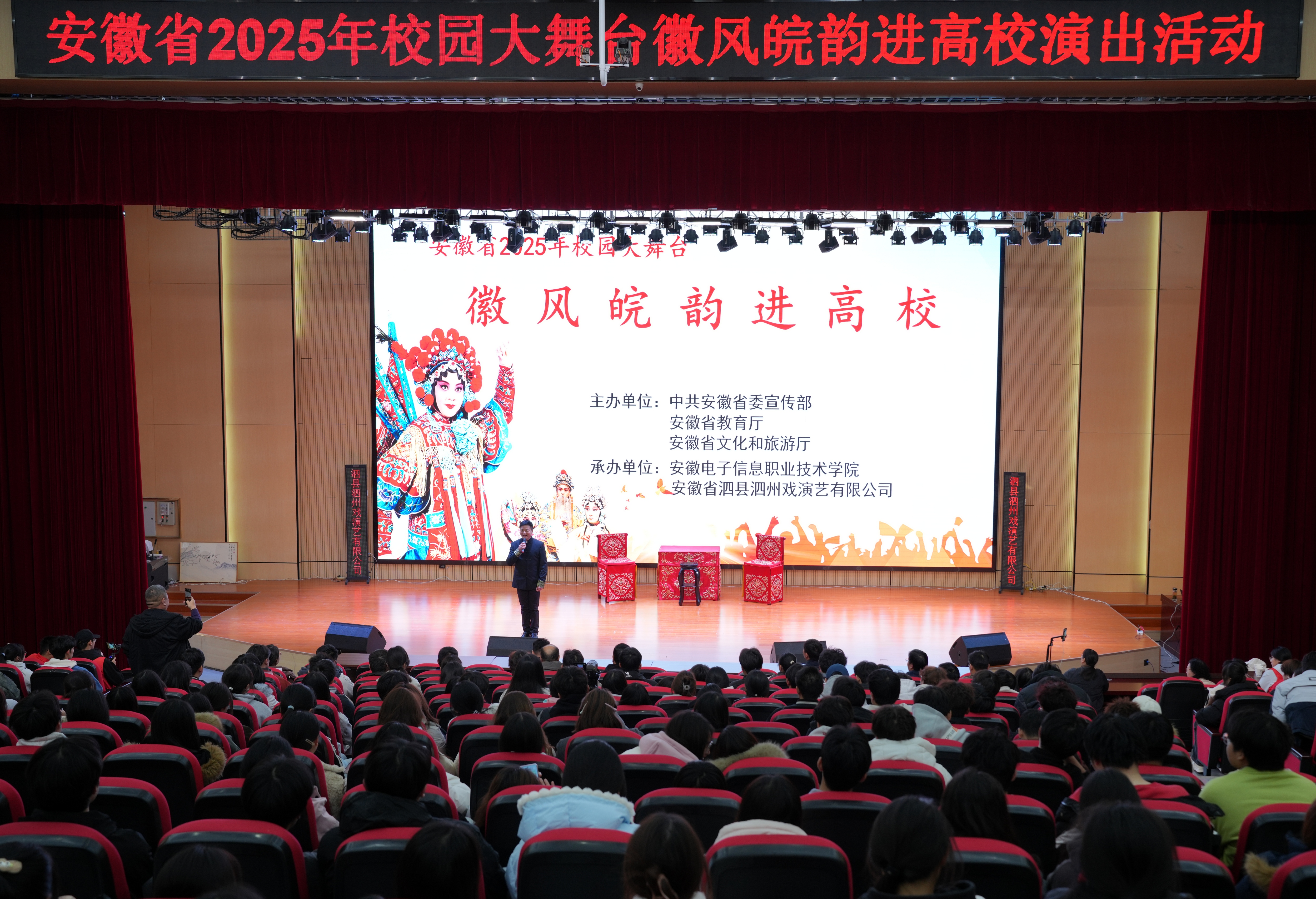 本网讯 11月26日下午,由省委宣传部、省教育厅、省文旅厅联合主办的2025年“校园大舞台—徽风皖韵进校园”活动在学院盛大开演。学院党委书记吴合金,党委委员、副院长冯兴祥,党委委员、纪委书记蔡学良与现场500余名师生齐聚一堂,共同欣赏泗县泗州戏演艺有限公司演员们带来的经典古装剧目《状元与乞丐》,在“拉魂腔”的独特韵味中触摸非遗温度。