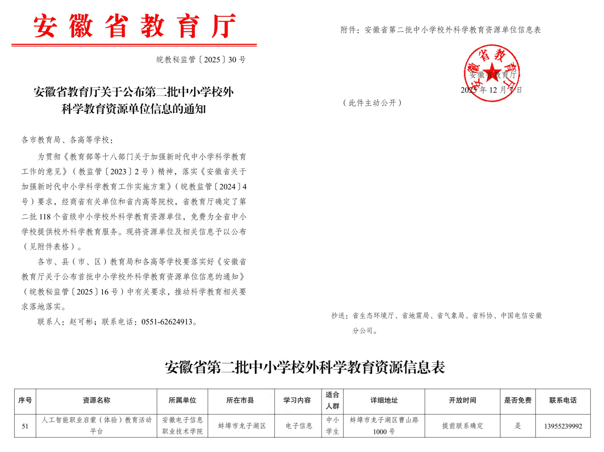 此次成功入选,既是对学院前期工作的肯定,更是开启青少年科学教育的新起点。学院将以此为契机,进一步深化“政校企社”协同机制,丰富特色课程供给,强化专业师资队伍建设,持续提升科学教育服务的精准度与实效性,全力打造具有区域影响力的青少年科学教育特色品牌,为“技能安徽”建设与中小学科学教育高质量发展赋能。(图/文:孙黎黎 预审:夏克付 审核:郑奕)