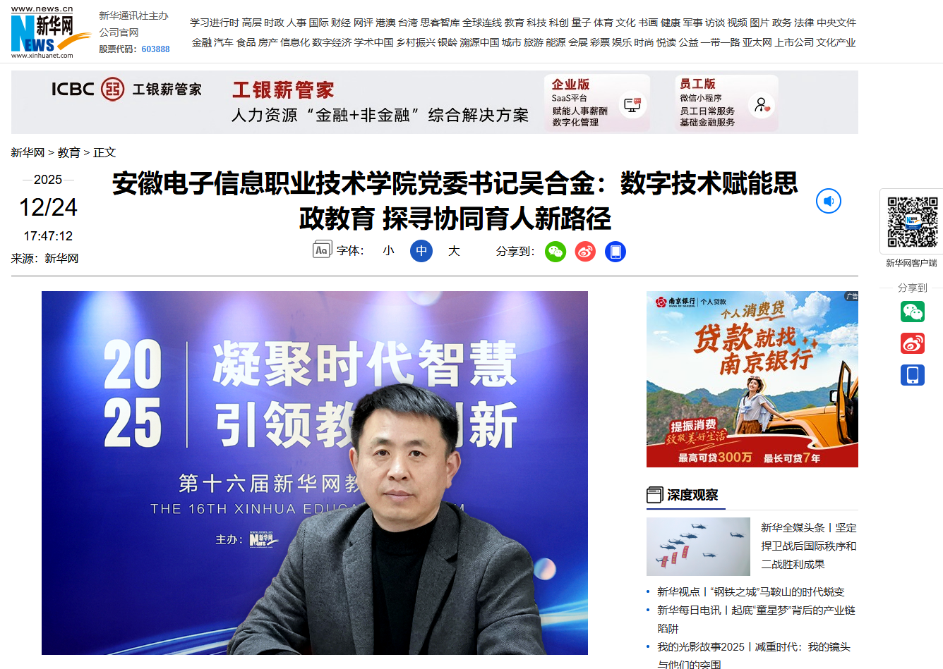 本网讯 近日,由新华网主办的第十六届新华网教育论坛在北京举行,论坛上表彰了一批全国教育创新与高质量发展优秀案例,学院荣膺新华网“2025高质量发展案例——数字赋能教育发展案例”,学院党委书记吴合金接受新华网专访。