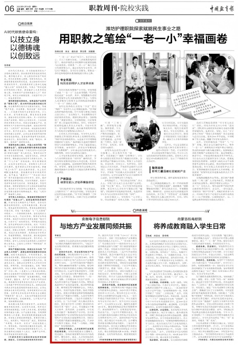 本网讯 近日,学院产教融合的创新实践获主流媒体专题报道。中国教育报以《安徽电子信息职业技术学院 与地方产业发展同频共振》为题,深入报道了学院通过构建“三位一体”合作体系、创新“双主体”培养模式,实现专业集群与区域产业精准对接的成果。报道引发社会广泛共鸣,获得业内高度评价。