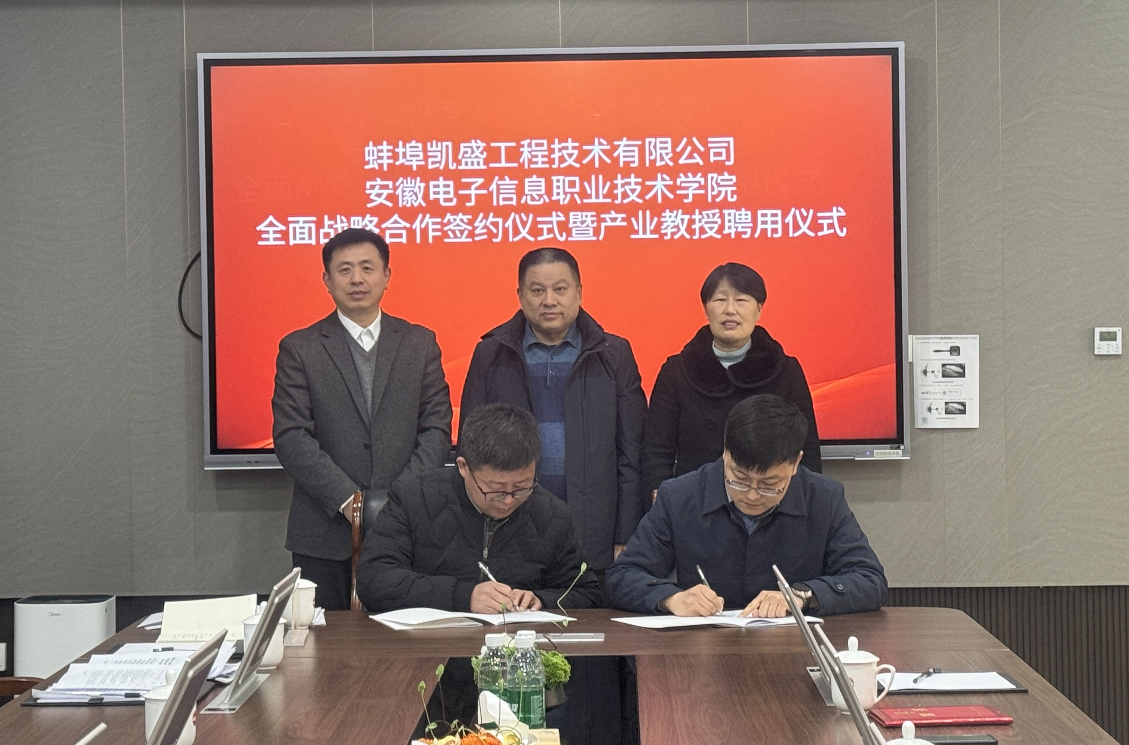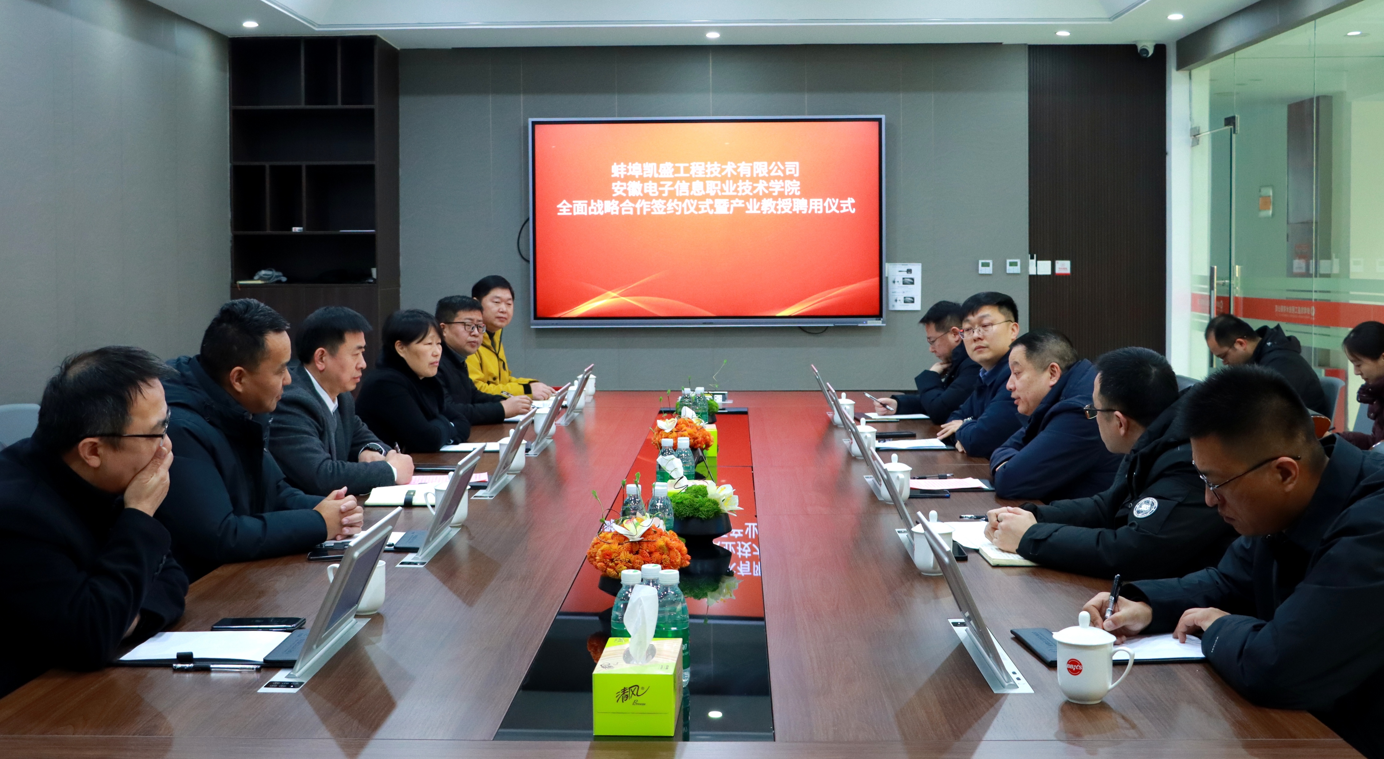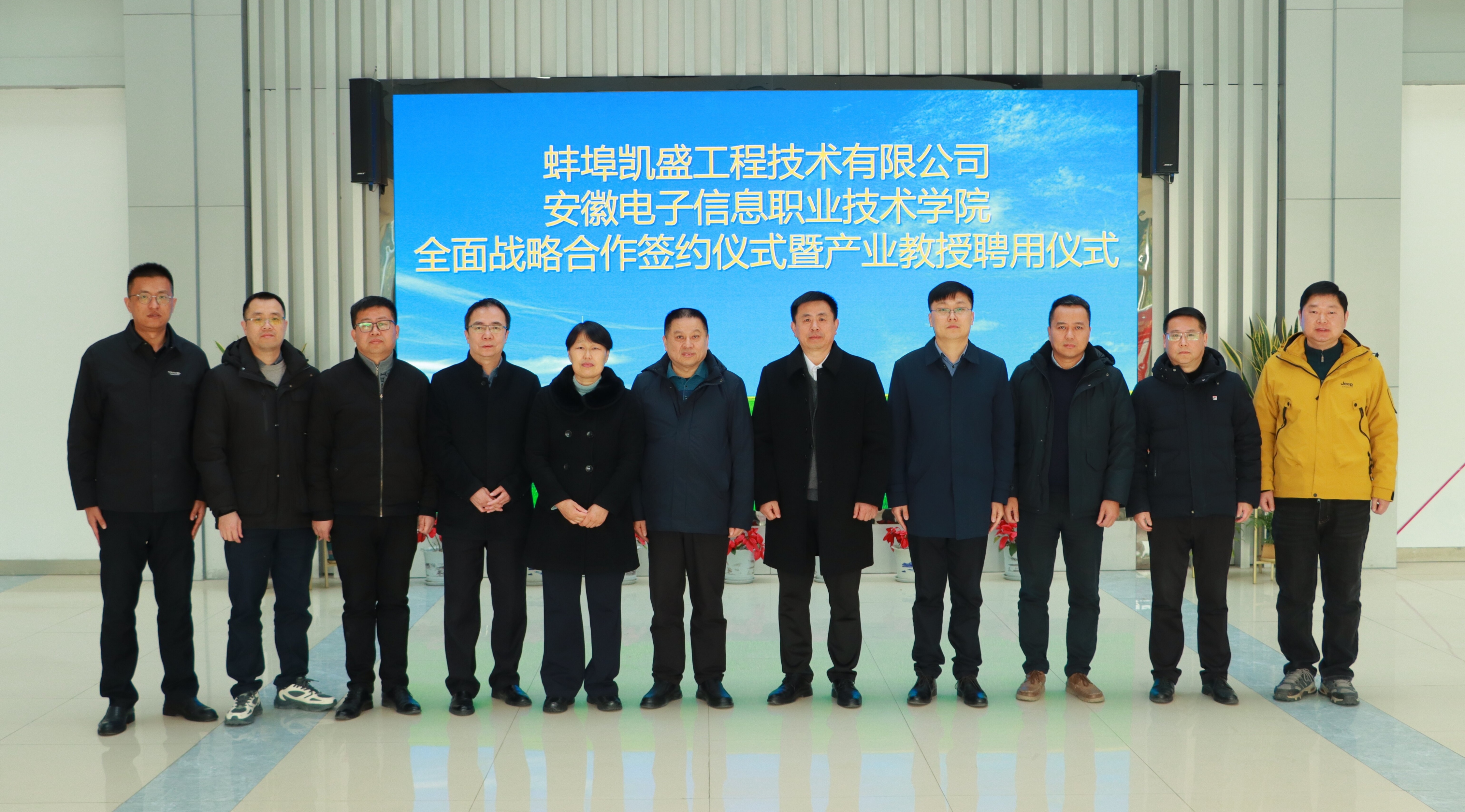 本网讯 1月8日,党委书记吴合金、院长李素文率队赴蚌埠凯盛工程技术有限公司,参加双方全面战略合作签约仪式暨产业教授聘用仪式。组织人事处处长郝志廷、机电工程学院副院长乔志杰及相关人员陪同参加。蚌埠凯盛工程技术有限公司党委书记、董事长叶坤,副总经理耿职及企业相关领导热情接待了学院一行。