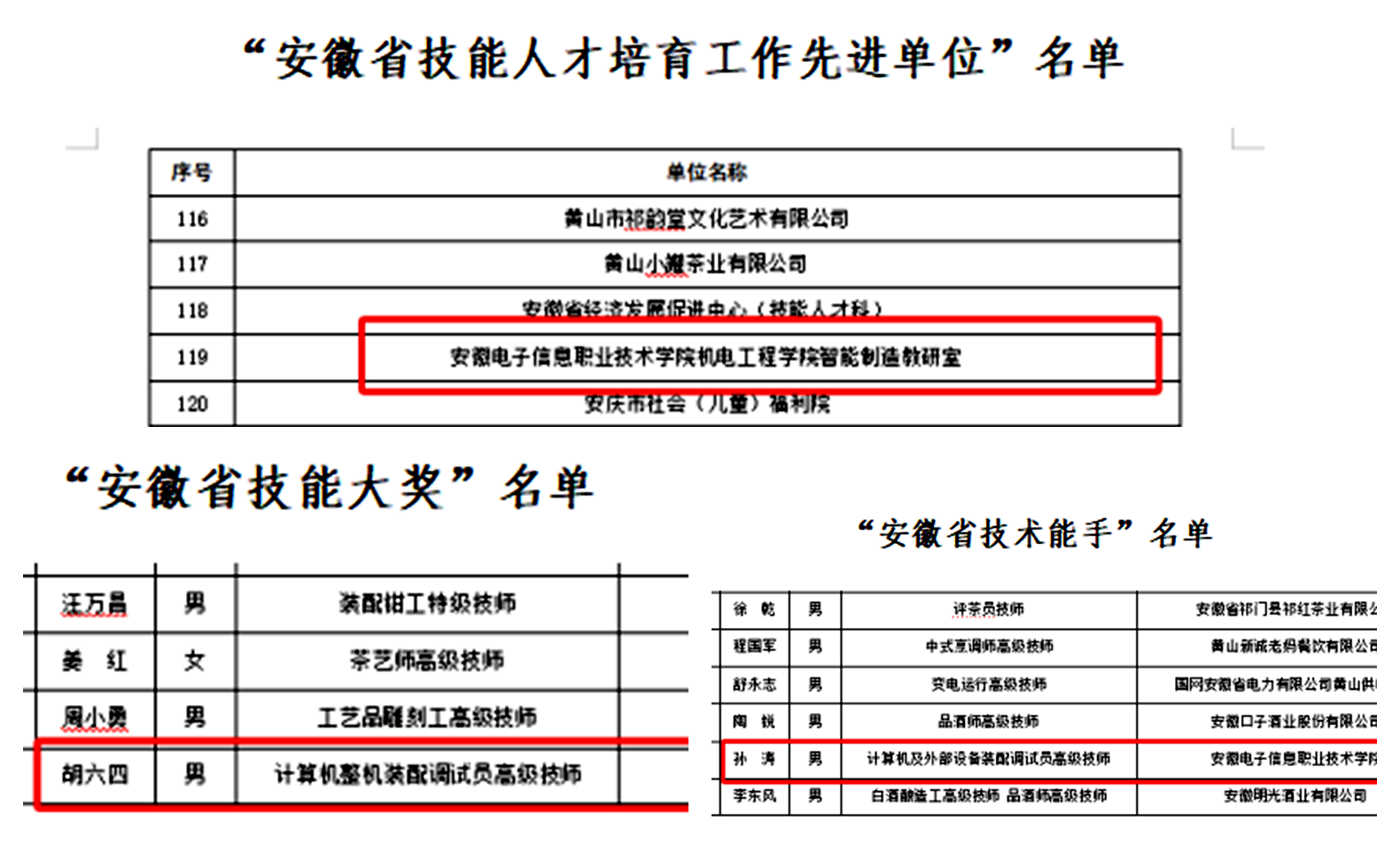 本网讯 近日,安徽省人力资源和社会保障厅正式公布《关于表彰第十五届全省高技能人才的决定》(皖人社发〔2026〕1号),学院在本次评选中表现突出,斩获多项殊荣。其中,机电工程学院智能制造教研室获评“安徽省技能人才培育工作先进单位”,软件工程学院胡六四老师荣获“安徽省技能大奖”,软件工程学院孙涛老师获评“安徽省技术能手”。