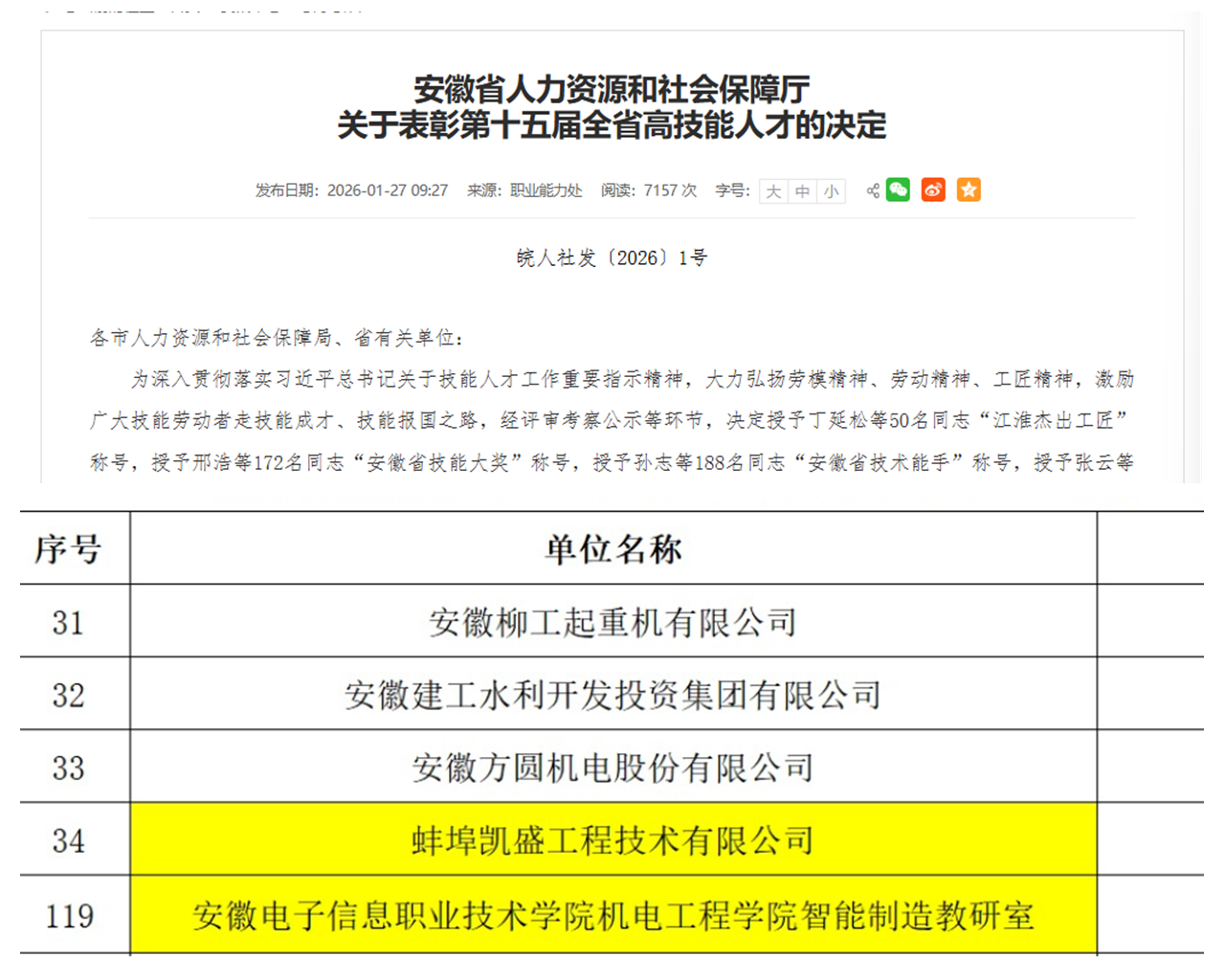 本网讯 近日,安徽省人力资源和社会保障厅公布了第十五届安徽省高技能人才表彰名单,安徽电子信息职业技术学院机电工程学院智能制造教研室与智能制造产业学院龙头企业蚌埠凯盛工程技术有限公司双双荣获 “安徽省技能人才培育工作先进单位”称号。这一荣誉的获得,是对双方长期深耕产教融合、协同培养高技能人才的高度肯定,也是校企双方在服务地方产业发展中取得的重要阶段性成果。