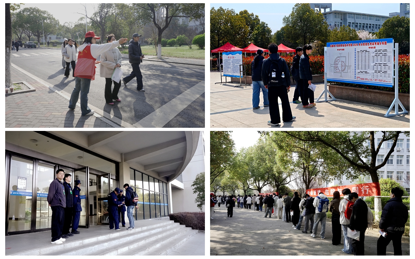 校园里,身着统一马甲的志愿者们成为一道亮眼的风景线。他们分布在东西门、教学楼及主干道旁,为初来乍到的考生提供路线引导、信息咨询、物资帮扶等及时周到的服务,用热情与耐心缓解考生的紧张情绪。学院各相关部门通力协作,全体工作人员坚守岗位、密切配合,从考务组织到后勤保障,从考场布置到应急处置,每一个环节都力求细致入微,为广大考生营造出温馨和谐、公开公平公正的考试环境。考场外,不少家长静静守候,或在树荫下轻声交流,或在宣传栏前了解学院专业信息,他们的目光中满是对孩子的期许与牵挂,为严肃的考试氛围增添了一抹温情。
