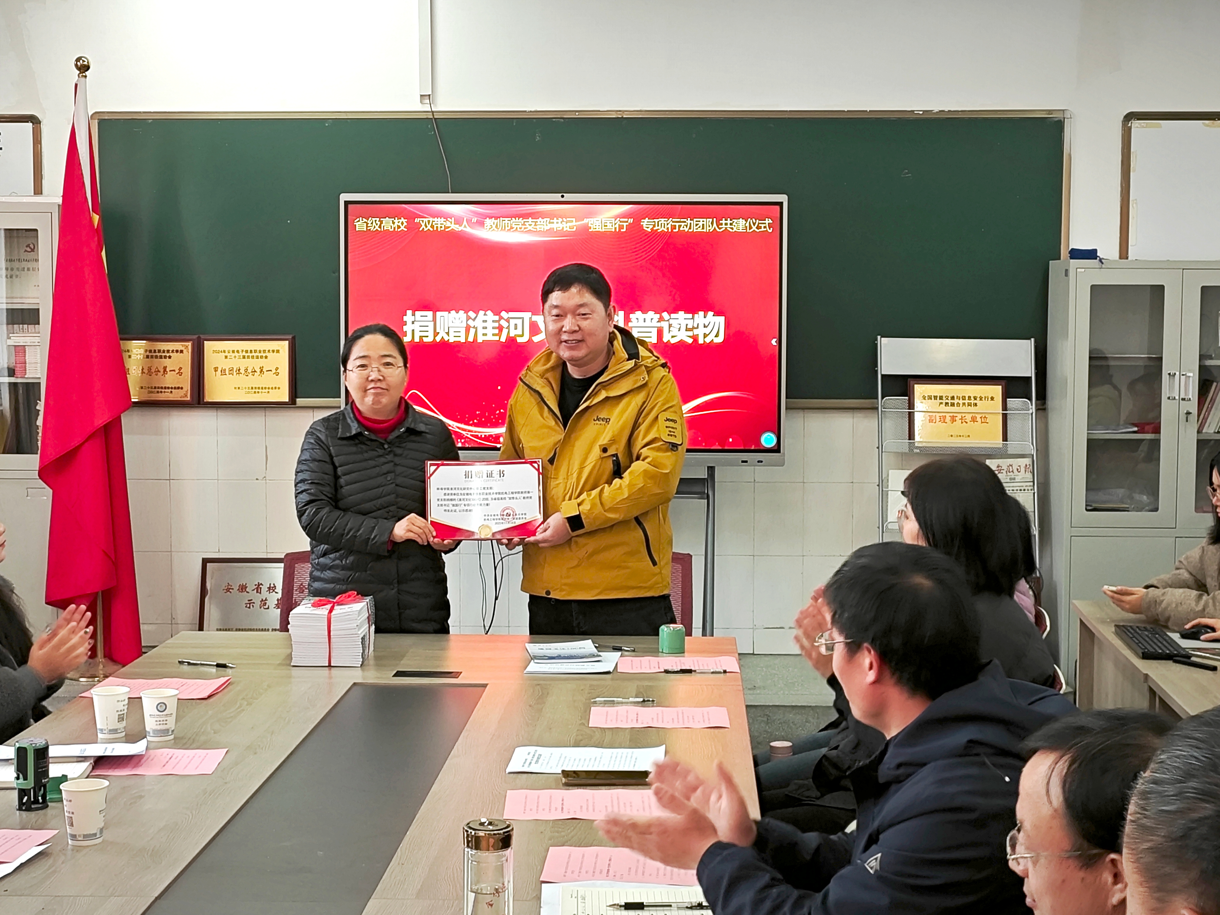 仪式开篇,查正卫介绍了出席嘉宾及共建初衷。赵世同在致辞中指出,此次共建既是党建引领下的校际合作新实践,更是“文化+技能”融合育人的重要探索——机电工程学院的专业教育优势与淮河文化研究中心的文化传承资源互补,将为人才培养注入“文化底蕴+专业技能”的双重动力。洪何苗则介绍了淮河文化研究中心在地域文化挖掘、科普传播方面的成果,期待以共建为桥梁,让传统文化为科技人才培育提供精神滋养。随后,双方党支部书记共同签署结对共建协议。蚌埠学院淮河文化研究中心教工党支部捐赠淮河文化科普读物,为师生搭建起接触地域文化、汲取精神养分的平台。仪式现场,全体人员集体学习了党的二十届四中全会精神,并围绕“淮河文化+工匠精神”展开深度研讨。