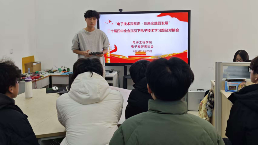 本网讯 为深入学习贯彻党的二十届四中全会精神,引导青年学子将个人发展与国家战略需求紧密结合,12月10日下午,电子爱好者协会在双创楼1406工作室举行专题学习与实训路径分享会。本次活动以“技术报国·创新成长”为主线,吸引了协会全体成员及学院电子技术爱好者共30余人参加。