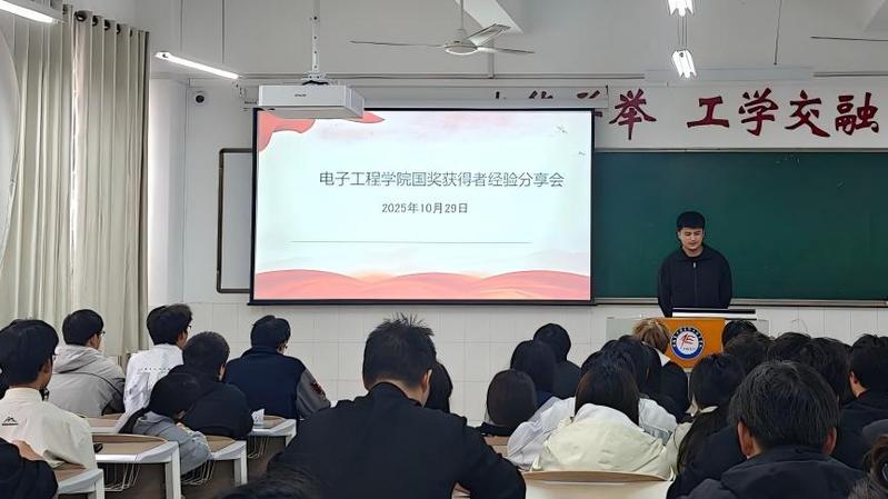 本网讯 为充分发挥优秀学子的榜样示范作用,激发全院学生的学习动力与进取精神,10月29日下午,电子工程学院学生会学习部于2301和2303教室举办“榜样领航,逐梦青春”国奖获得者经验分享交流会。集成242班张其好、新能源242班葛立政两位国奖获得者倾情分享,近180名学子到场参加。