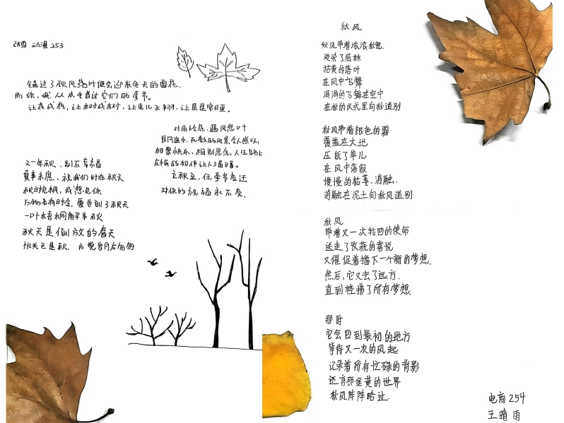 活动伊始,社团负责人吴灿简要说明了安全与环保注意事项,并通过朗诵秋日美文,将同学们带入诗意的秋日情境。随后,30余名社员分组漫步于林荫小径,细心拾取形态、色彩各异的落叶作为创作素材。在创作环节,同学们以秋叶为载体,围绕“给冬天的一封信”主题,或吟诗、或撰文、或寄语,将内心的所思所感倾注笔端。活动现场静谧而专注,墨迹与叶脉交织,情感与文字共鸣。活动最后,大家将落叶与手稿创意拼贴,制成独一无二的“落叶信”纪念品,并合影留念,为这场秋日雅集画上了圆满的句号。