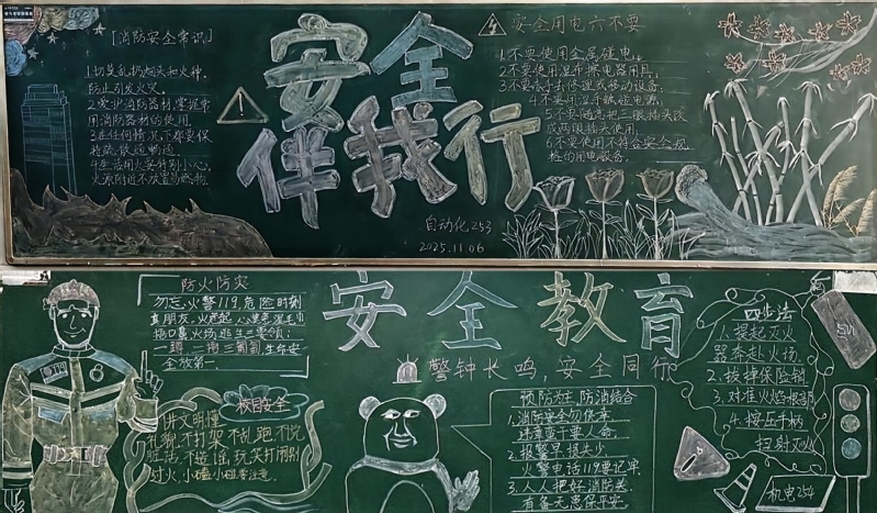 此次活动面向机电工程学院全体班级,旨在通过黑板报这一传统宣传载体,让消防安全知识更加深入人心。各班级积极响应,围绕主题精心策划,从版面设计、内容编排到绘画书写,均展现出高度的参与热情和专业特色。板报内容涵盖了火灾预防要点、宿舍用电规范、应急逃生技巧等实用知识,图文并茂,既有警示性教育,又不失生动活泼。比赛从主题契合度、版面美观性、内容创新性和书写规范性等多维度进行综合打分,最终,工业互联网252班以96.00分的优异成绩拔得头筹,荣获一等奖;自动化251班和自动化253班分获二等奖;机电254班、工业机器人251班、城轨机电251班并列荣获三等奖。