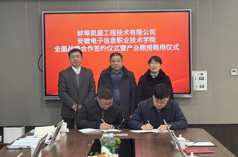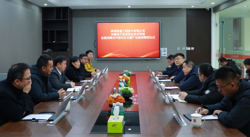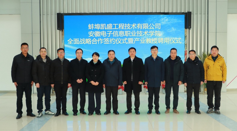本网讯 1月8日,党委书记吴合金、院长李素文率队赴蚌埠凯盛工程技术有限公司,参加双方全面战略合作签约仪式暨产业教授聘用仪式。组织人事处处长郝志廷、机电工程学院副院长乔志杰及相关人员陪同参加。蚌埠凯盛工程技术有限公司党委书记、董事长叶坤,副总经理耿职及企业相关领导热情接待了学院一行。仪式由耿职主持。