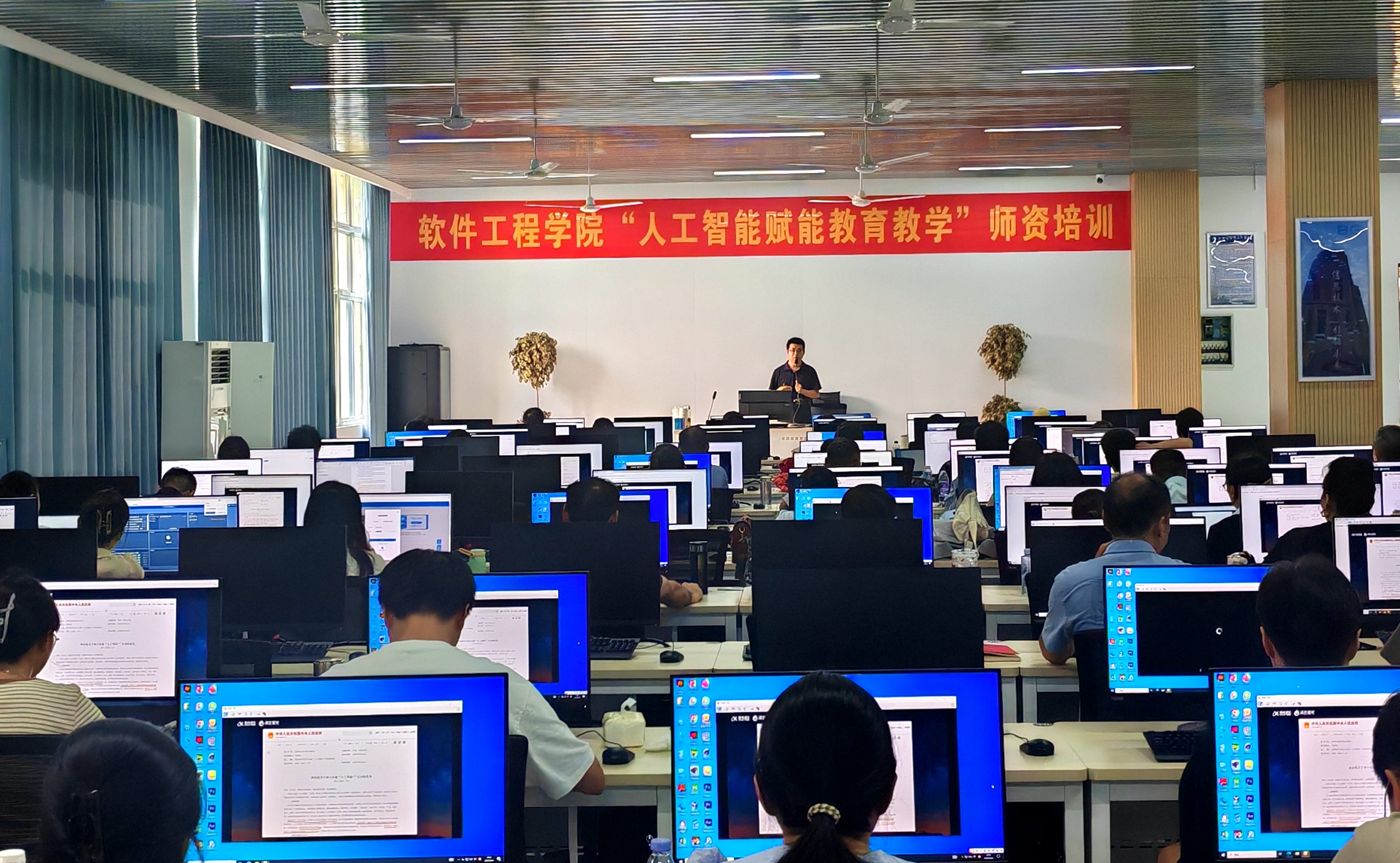 本网讯 为深入贯彻落实国家教育数字化战略行动,积极响应《国务院关于深入实施“人工智能+”行动的意见》要求,主动应对人工智能技术对教育领域带来的深刻变革,全面提升教师人工智能素养与教学创新能力,软件工程学院于9月3日至4日,在信息中心北101实训室成功开展“人工智能赋能教育教学”专题师资培训。