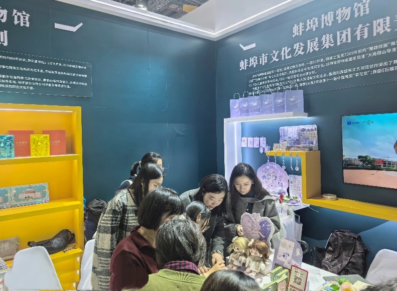 展会期间,工作室同步设置双墩文化体验式印章打卡活动,将双墩遗址代表性文化符号融入印章设计,观众可通过现场盖章互动,直观感受蚌埠史前文化的独特魅力,充分展现了“蚌小贝”品牌的创新活力与文化内涵。此次文创教学成果的成功落地与市场亮相,不仅是我院在历史文化传承教育领域的创新实践,更标志着学校产教融合工作向纵深推进,为培养高技能人才提供了坚实支撑。 (图/文:李苗苗 审核:夏克付)