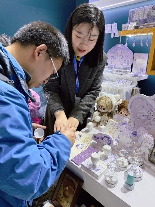 展会现场,两位老师聚焦创意产业与专业教学、人才培养的深度融合,围绕长三角地区博物馆文创衍生品开发、传统技艺传承创新、文创产品市场转化、行业岗位需求等核心议题,与参展企业负责人、非遗手工匠人、独立品牌设计师展开深入交流,全面把握文旅融合、数字文创、非遗活化等领域的最新发展趋势,为专业教学改革和人才培养方向积累了宝贵经验。