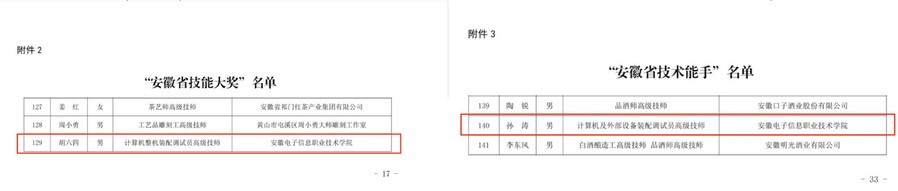 本网讯 近日,安徽省人力资源和社会保障厅正式公布《关于表彰第十五届全省高技能人才的决定》(皖人社发〔2026〕1号),学院在本次评选中表现突出,斩获多项殊荣。其中,软件工程学院胡六四老师荣获“安徽省技能大奖”,软件工程学院孙涛老师获评“安徽省技术能手”。