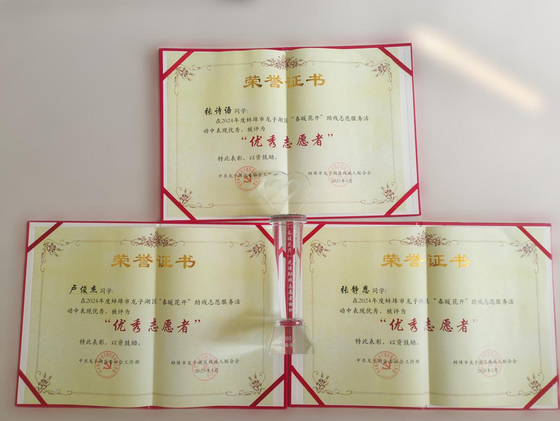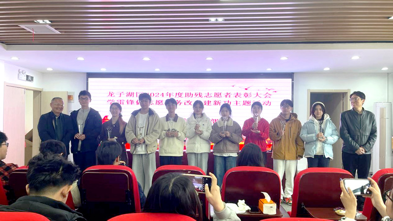 本网讯 近日,在由蚌埠市龙子湖区委社会工作部和龙子湖区残联共同举办的“学雷锋 做志愿 服务改革建新功”主题助残志愿者表彰大会上,信息工程学院青年志愿者协会再次获评“先进助残志愿者组织”,计用2294班张诗语、计用238班卢俊杰、计用2291班张静恩3位同学获“优秀志愿者”荣誉称号。