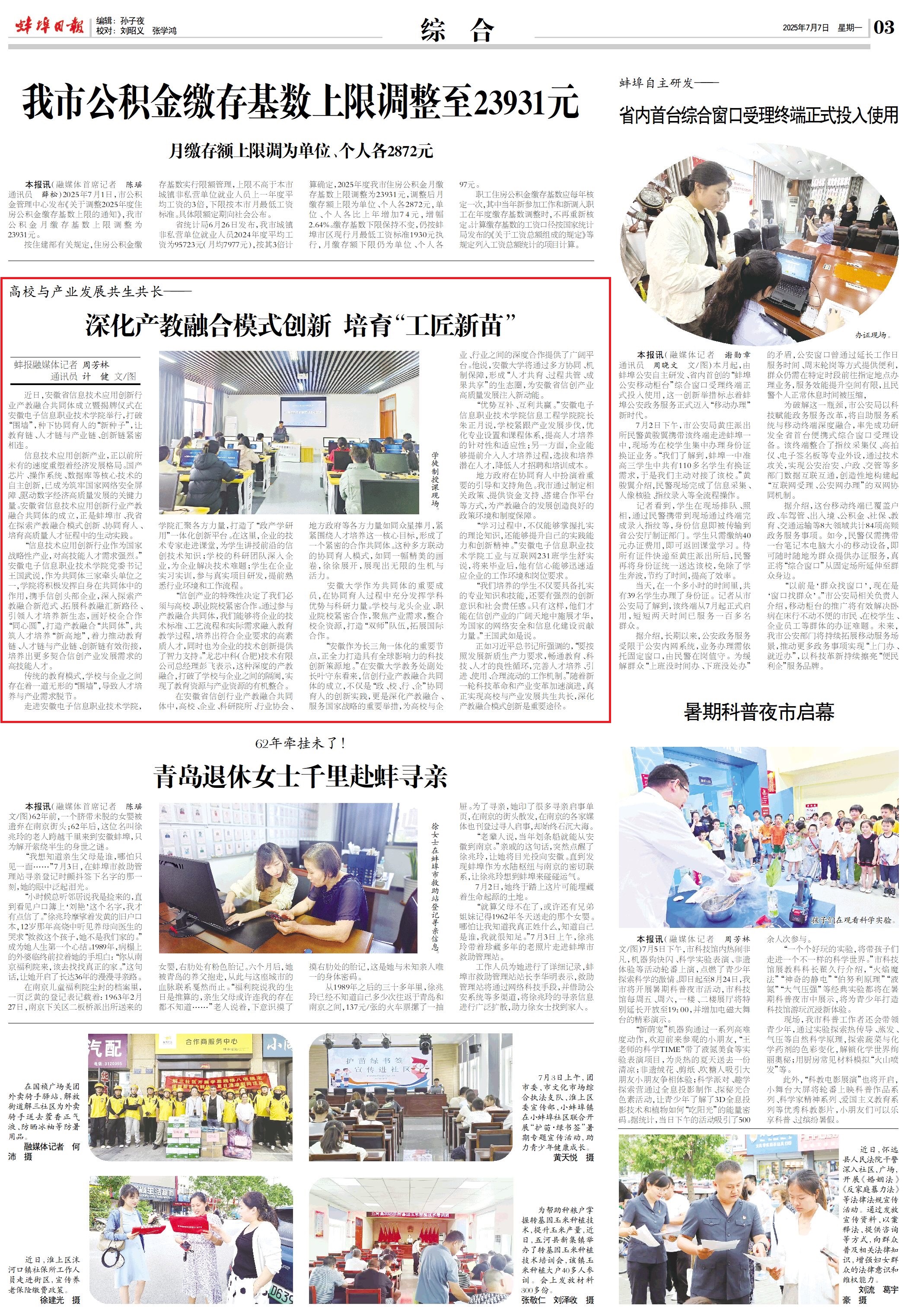 2025年7月7日,蚌埠日报综合专栏报道安徽省信息技术应用创新行业产教融合共同体成立大会在安徽电子信息职业技术学院举行,并以“高校与产业发展共生共长——深化产教融合模式创新 培育‘工匠新苗’”为主题综合报道学院在探索产教融合模式创新、政行企校协同育人、培育高质量人才等方面的突出成绩,着力推动教育链、人才链与产业链、创新链有效衔接,培养出更多契合信创产业发展需求的高技能人才。