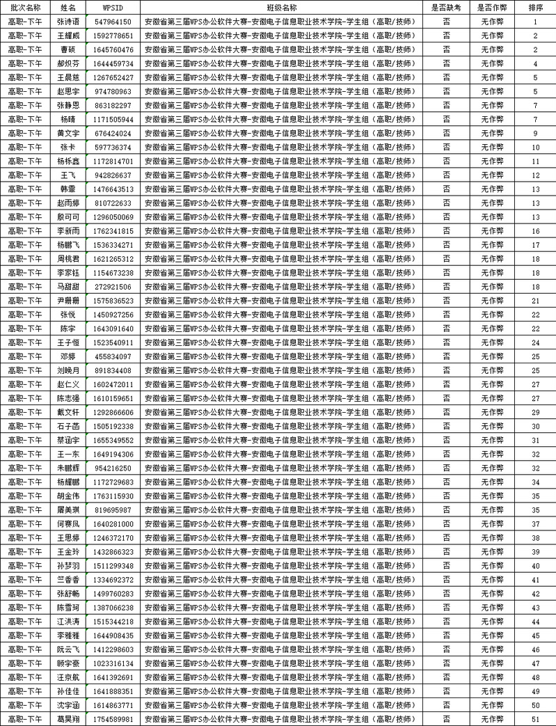 由教学科研处主办、信息工程学院承办的安徽省第三届WPS办公软件应用能力大赛校级选拔赛,于2025年11月1日顺利完成,全院共有52名同学参赛,根据《安徽电子信息职业技术学院职业技能竞赛管理办法》(院办〔2022〕39号)文件要求,现将本次选拔赛的成绩进行公示。