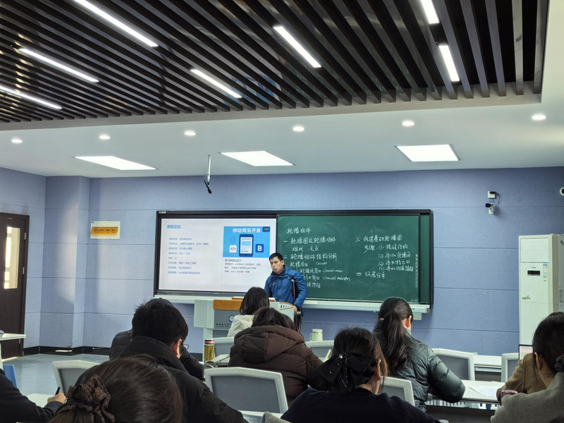 本网讯 为进一步提升教师教学能力,促进教学经验交流与分享,12月10日下午,信息工程学院在智慧教室302开展了本学期第3次公开示范课活动。本次示范课由Web前端开发教研室孟昕老师主讲,学院全体教师及兄弟部门教师代表到场观摩学习。