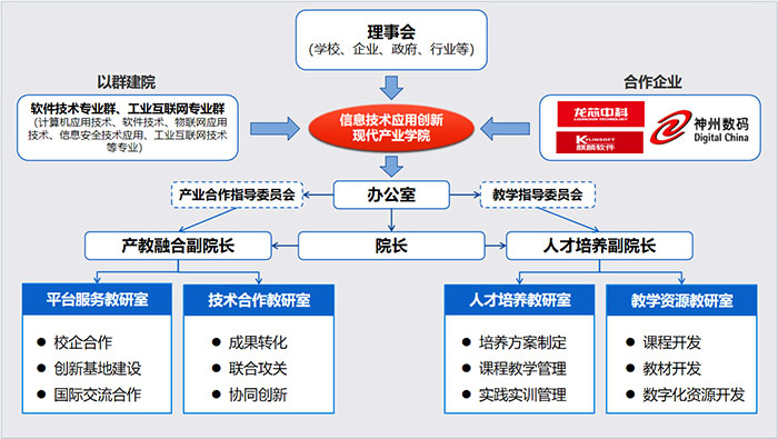 产业学院实行理事会领导下的院长负责制,成立由校企双方代表组成的理事会,负责对产业学院专业设置和专业建设、培养方案制订、课程建设、“双师双能型”教师队伍建设、校内外实验实习实训基地建设等重大问题进行审议、决策、检查、指导、咨询、监督和协调,实施“九个共同”校企双主体育人模式改革,力争成为区域信创产业人才培养核心基地、校企协同创新示范平台,为国产信息技术自主可控与产业高质量发展提供坚实人才保障和持续智力支撑。