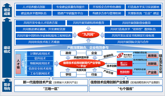 信息技术应用创新现代产业学院(省级)是安徽电子信息职业技术学院积极响应国家信创产业发展战略,联合信创领域龙头企业(芯片、操作系统、应用软件等企业)共建的产教融合协同创新与育人平台,聚焦“人才培养、技术创新、产业服务”三位一体目标,旨在打通“教育链、人才链、产业链、创新链”,打造信创行业人才培养高地,为信创产业培育具备实践能力与创新思维的高技能人才,服务区域战略性新兴产业发展。