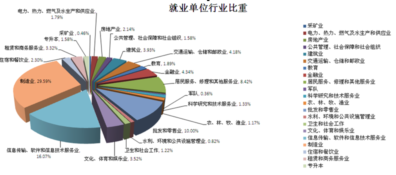 在毕业生就业的行业分布上,我院毕业生主要从事的行业是制造业、信息传输、软件和信息技术服务业、居民服务、维修和其他服务业、批发和零售业,与我院以电子信息、机械与经典类为主的专业人才培养方向相符。