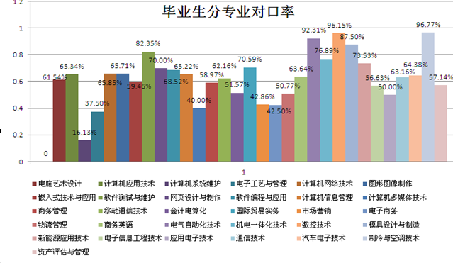 2015年毕业生就业的对口率基本符合就业单位中的岗位设置,能够达到学以致用,其中制冷空调与技术专业的对口率最高,达到96.77%。 其他分专业就业对口率如下图:
