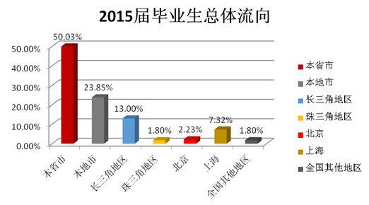 2015年学院毕业生在学院所在地区就业人数为483人,就业人数及比例分量显著增加,这也我们加强就业指导工作,改变学生的就业观念不断努力有关,另外,随着产业结构的调整,制造业开始向中西部转移,蚌埠地区经济的发展及城市建设,加之毕业生的薪酬水平也随之提高,学院招生的生源地也基本上皖北地区,所以留在本地区就业发展,也成为毕业生就业的首先考虑的主要因素。