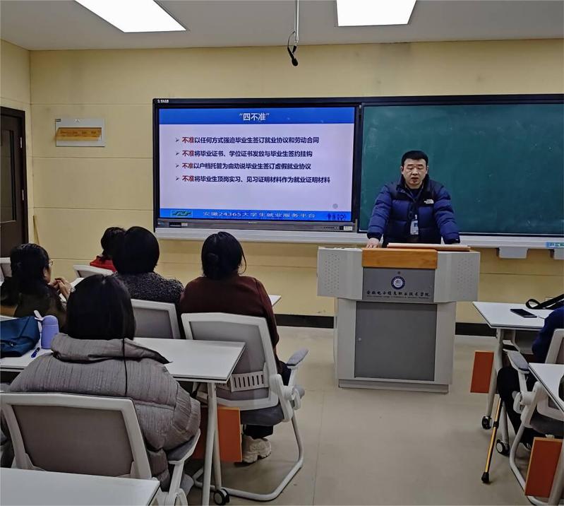 在省级就业平台的使用培训环节,张主任详细介绍了安徽省大学生就业服务平台的各项功能,包括学生就业意向问卷填写、生源基本信息核对、就业信息填报、网络求职功能的运用等操作流程,帮助辅导员更好地指导学生使用平台,获取更多就业资源。针对毕业生就业数据的审核,张主任依据教育部和安徽省教育厅的相关规定,明确了审核标准和流程,要求辅导员认真核对每一位毕业生的就业信息,确保数据真实、准确、完整,严格杜绝任何虚假就业信息的出现,维护学院就业数据的公信力。